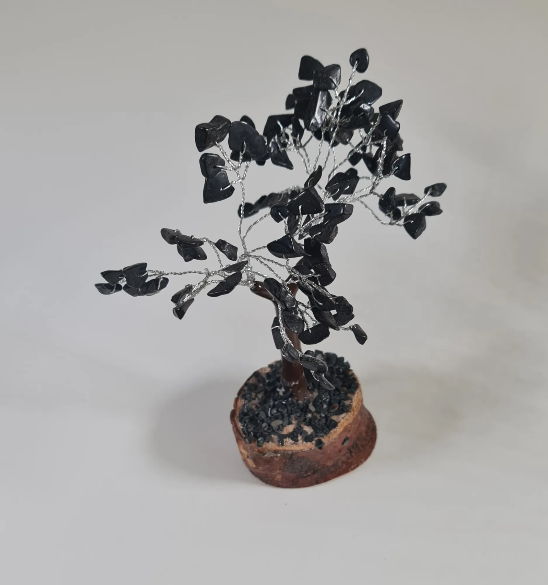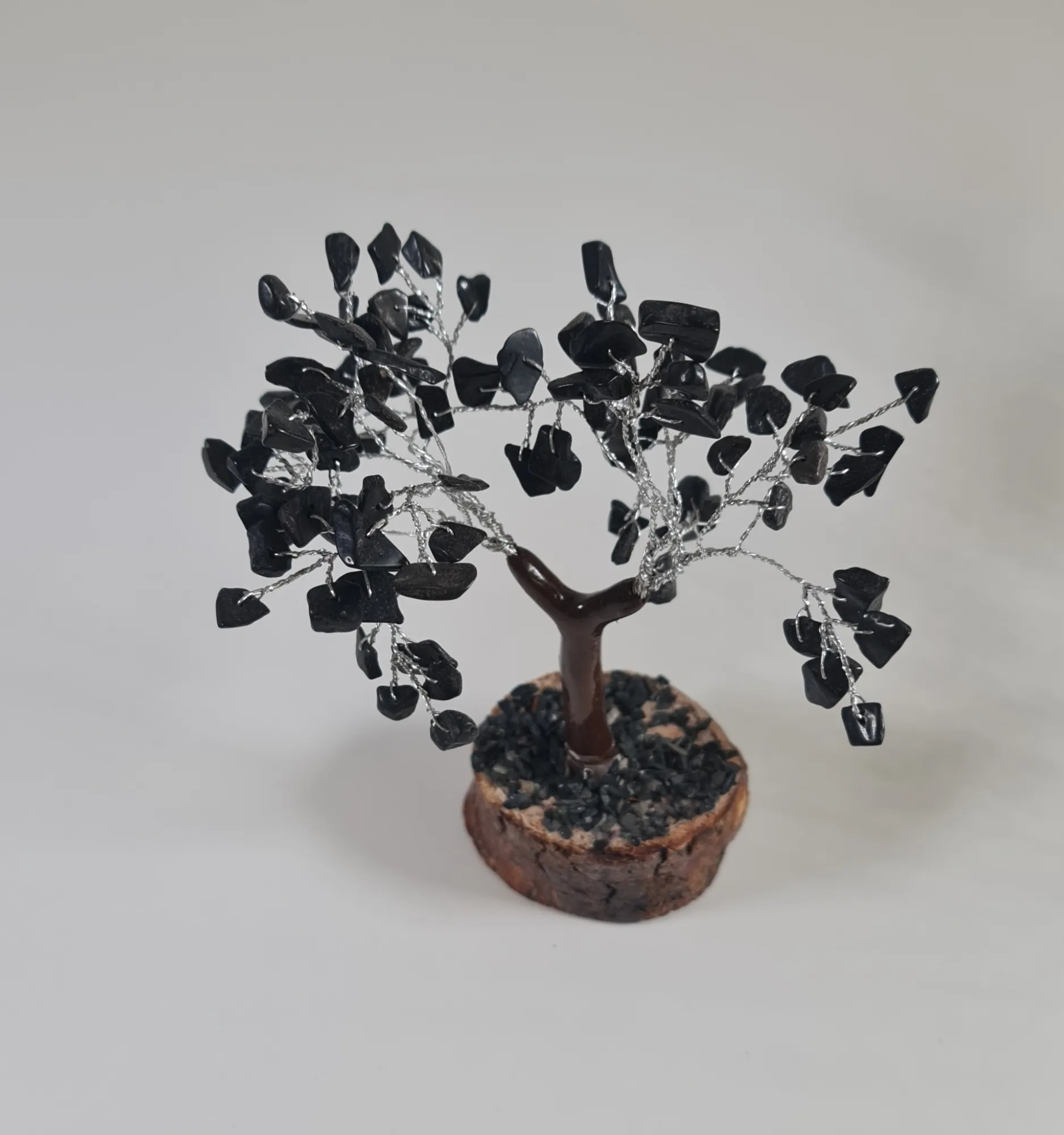 El bonsái de turmalina es una pieza única que combina la elegancia de la naturaleza con el poder de las piedras preciosas. Este delicado árbol artesanal está elaborado con alambre moldeable y decorado con pequeñas piedras de turmalina negra, conocidas por sus propiedades protectoras y equilibrantes. La base de madera natural le da un toque rústico y auténtico, ideal para complementar cualquier espacio, ya sea en tu hogar, oficina o área de meditación.