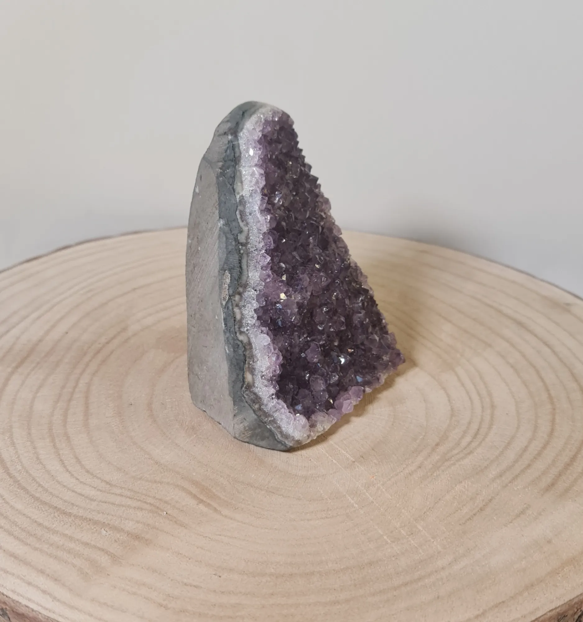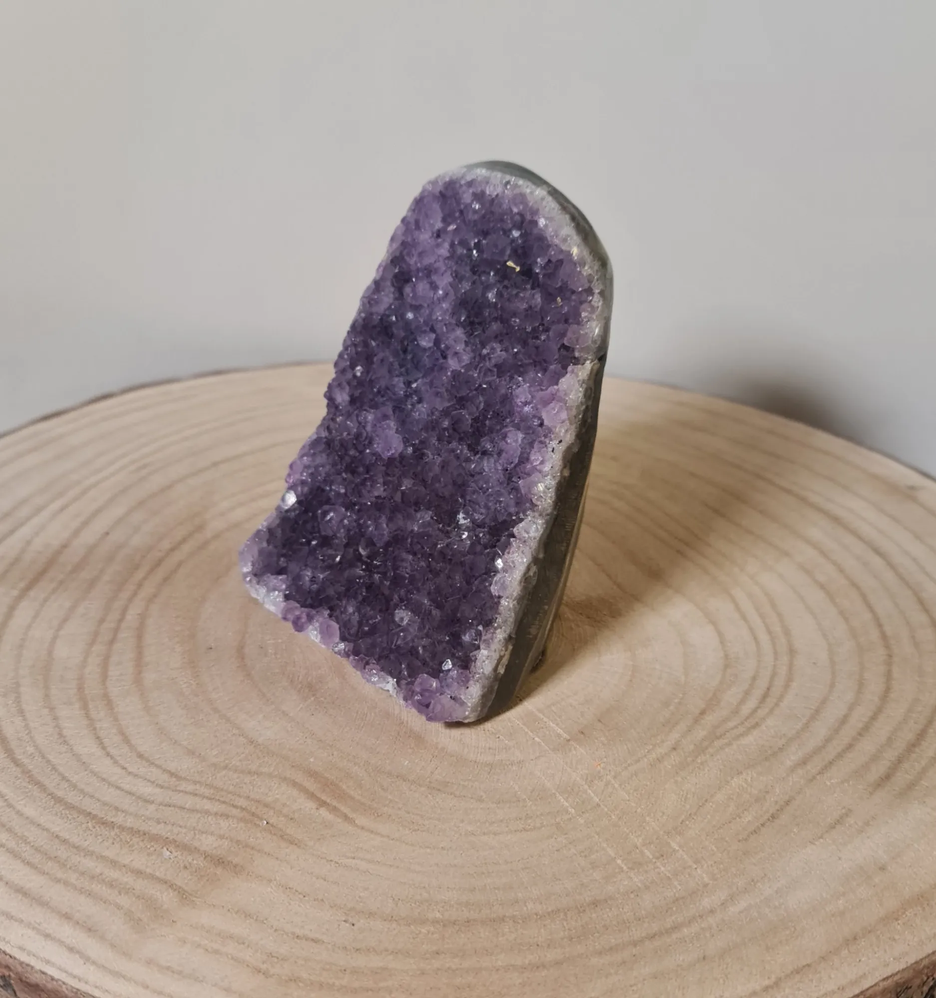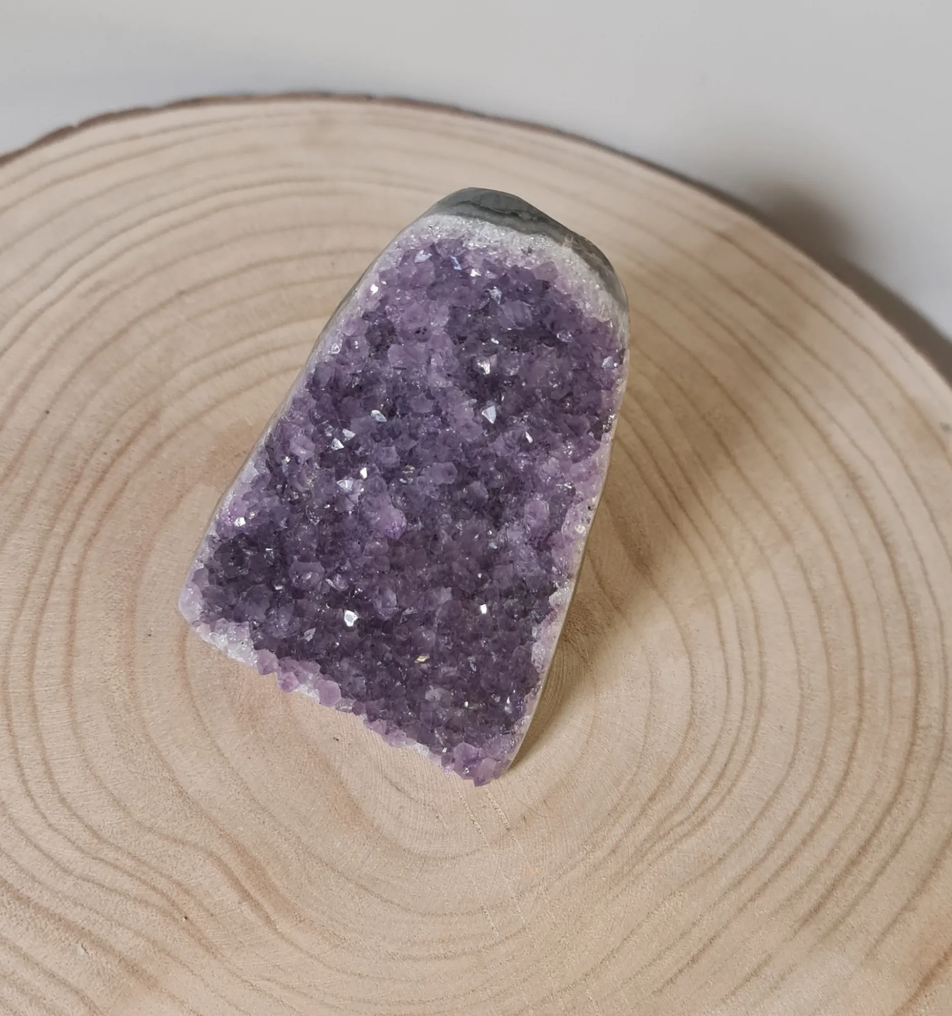 La amatista ha sido valorada a lo largo de la historia por su capacidad para calmar la mente y el cuerpo. Utilizada por los antiguos griegos y romanos para evitar la embriaguez y mantener el control emocional, la amatista ha sido símbolo de protección y equilibrio espiritual. Las drusas, como esta, se forman en cavidades volcánicas y se encuentran principalmente en Brasil y Uruguay, donde los mejores ejemplares son extraídos.