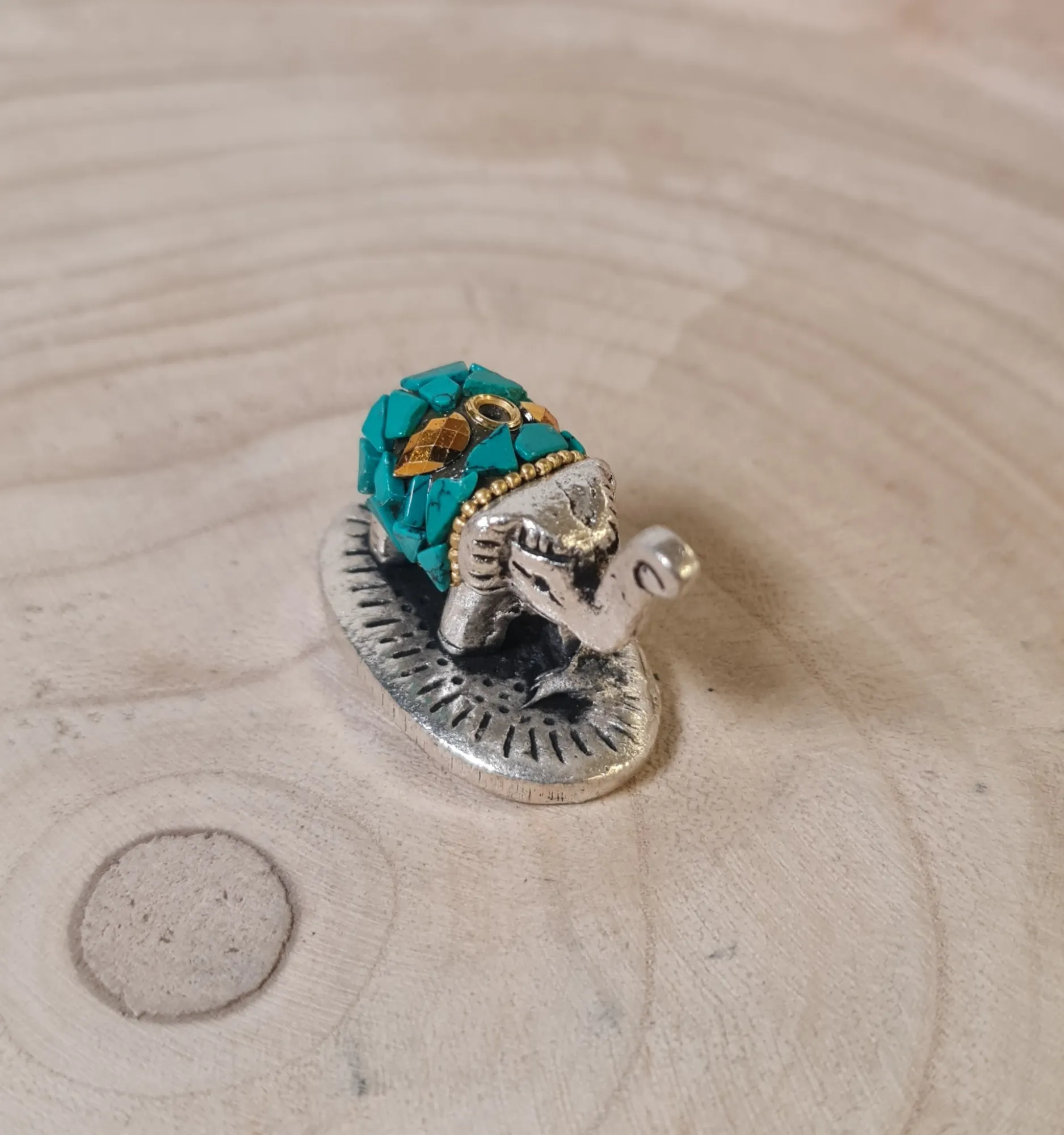 - Decoración elegante: Ideal para adornar cualquier rincón, su diseño detallado en color plata y mosaicos turquesa lo convierte en una pieza decorativa versátil.