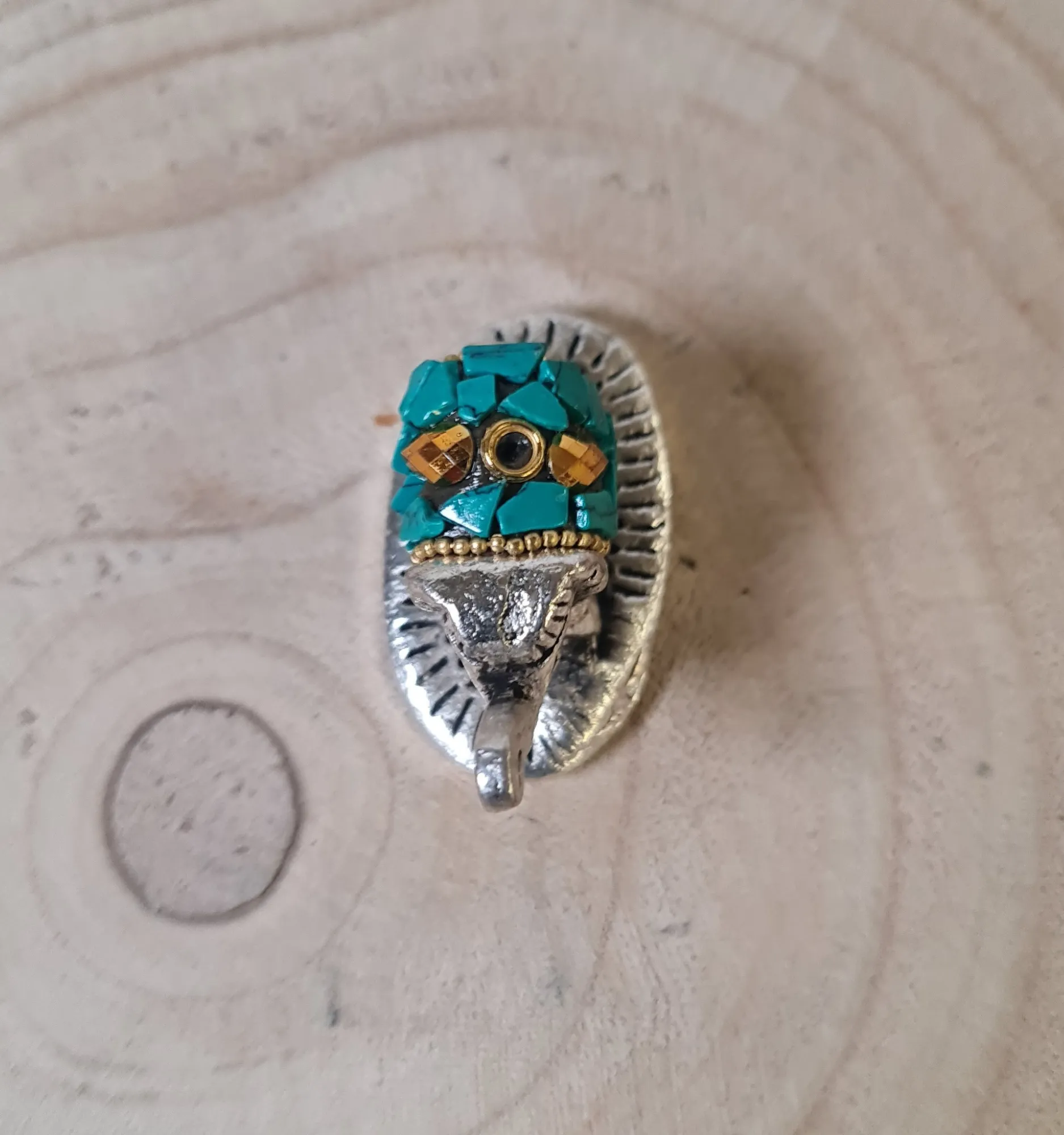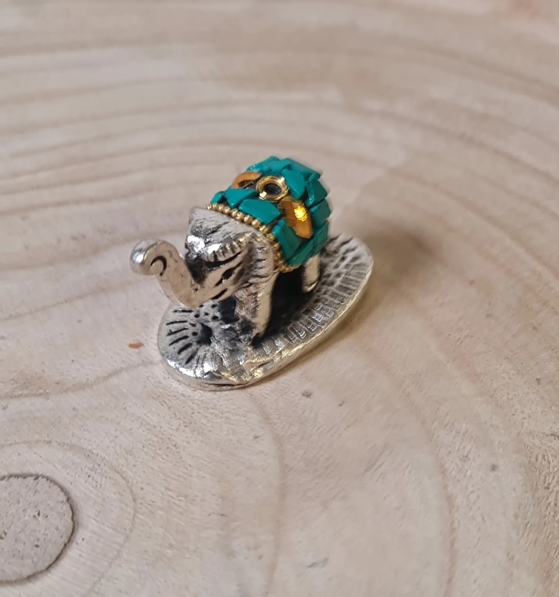 Este hermoso elefante en miniatura color plata es una pieza decorativa que combina elegancia y significado simbólico. Con detalles intrincados en su diseño y un toque de mosaicos en tonos turquesa y dorado, este elefante se convierte en un amuleto ideal para atraer la buena suerte, la sabiduría y la protección a cualquier espacio. Su tamaño compacto lo hace perfecto para colocarlo en cualquier lugar, desde escritorios hasta estantes decorativos.