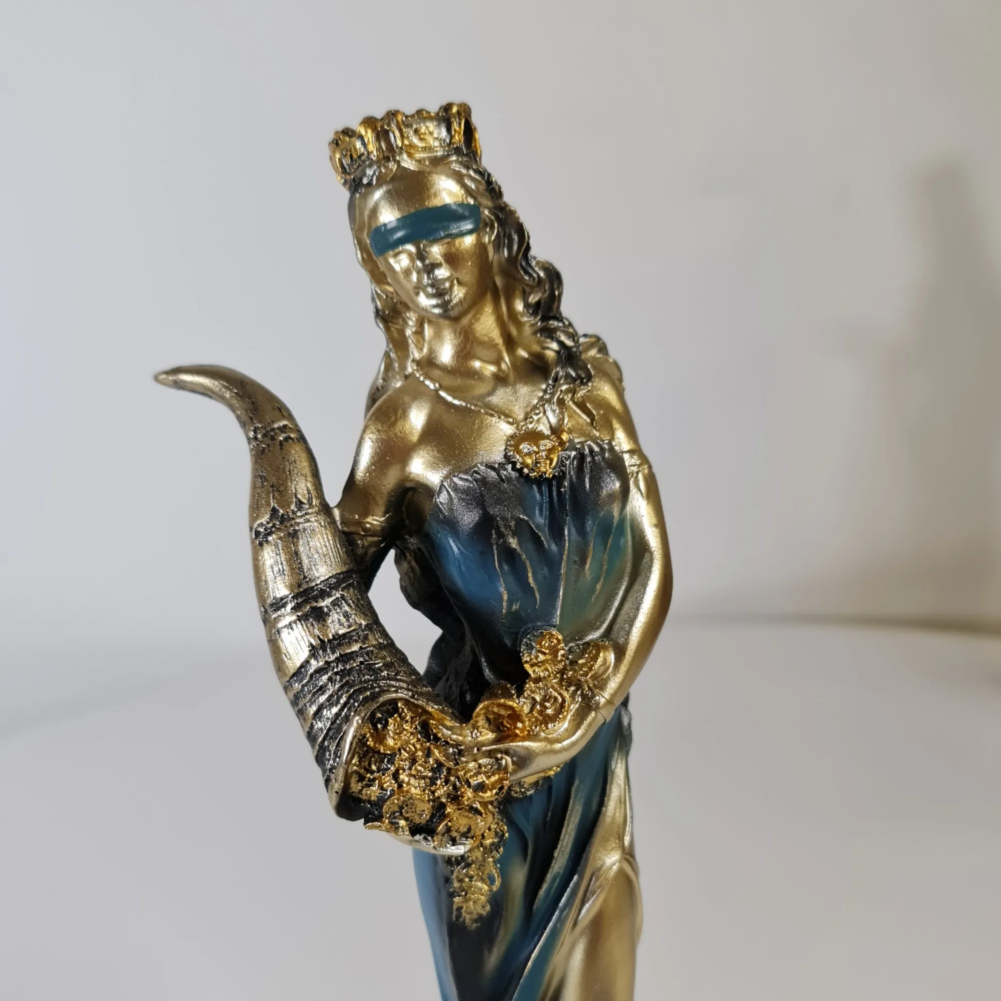 Inspirada en Fortuna, la divinidad romana asociada al destino y la prosperidad, esta figura reproduce todos los elementos clásicos: la venda en los ojos que representa la imparcialidad del azar, la corona que simboliza poder y soberanía, y la cornucopia como fuente inagotable de riqueza. En esta versión contemporánea de 27 cm, la paleta de color dorado con vestido azul proyecta un contraste armonioso entre poder espiritual y tranquilidad emocional. Su diseño evoca siglos de mitología y arte, reimaginados para el presente.