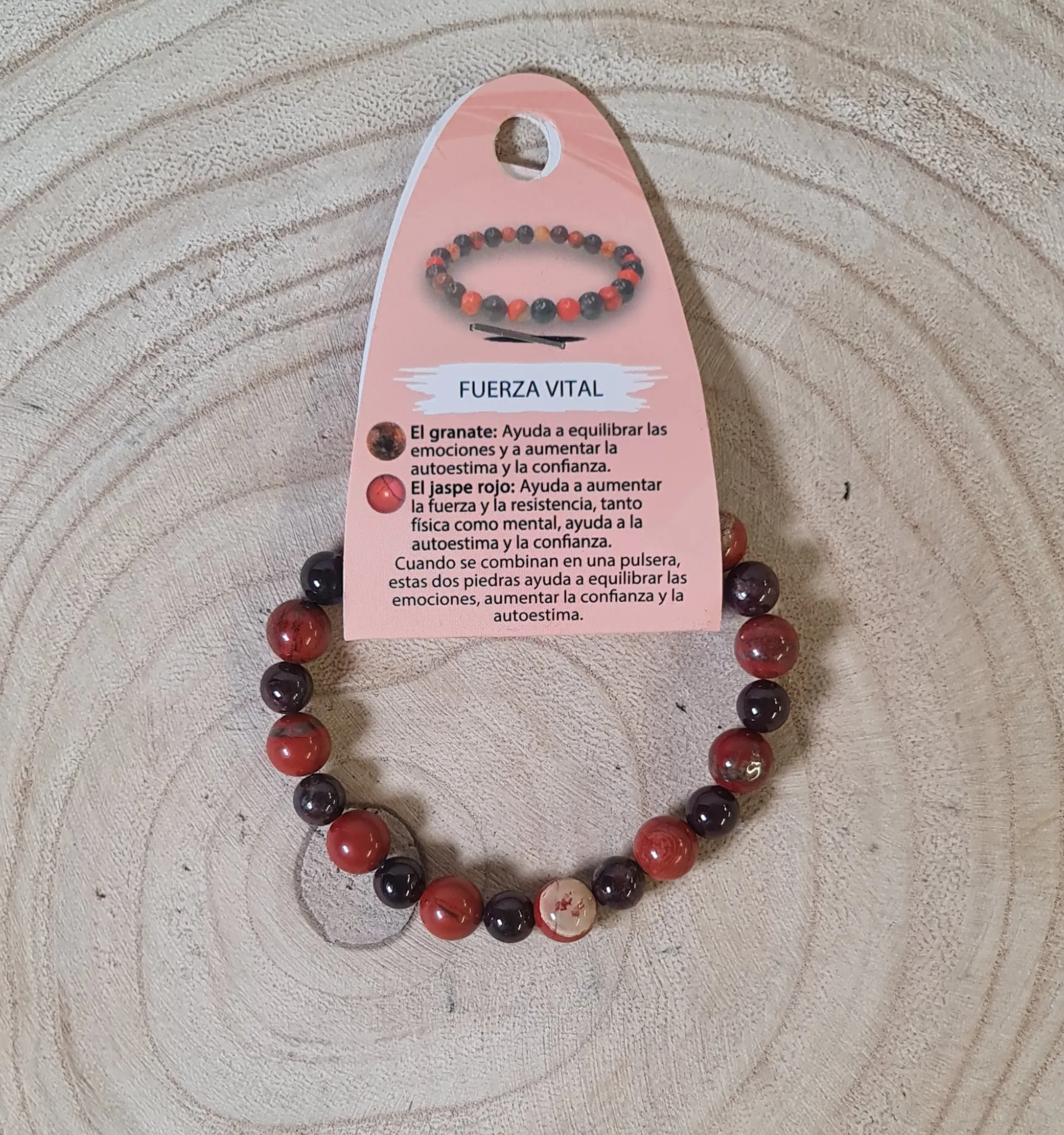 La Pulsera Fuerza Vital está diseñada para proporcionar energía, vitalidad y fortaleza emocional. Confeccionada con piedras de jaspe rojo y granate, esta combinación ayuda a aumentar la resistencia física, mejorar el equilibrio emocional y fortalecer la autoestima.