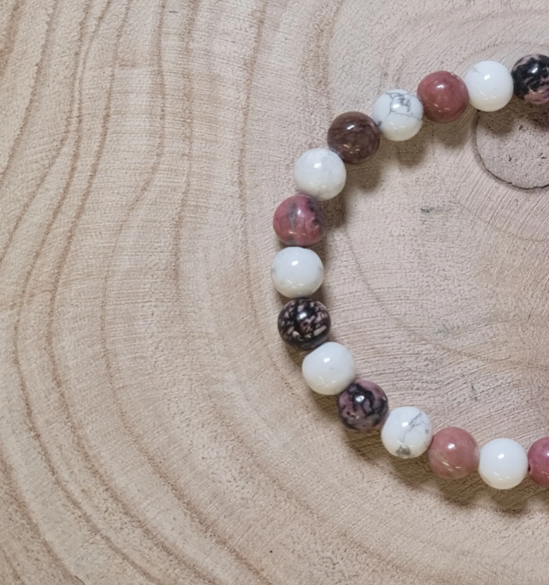 La rodonita ha sido reconocida por su capacidad para sanar heridas emocionales y promover el amor propio. Desde tiempos antiguos, se ha usado como piedra de compasión y sanación emocional. La howlita, conocida por sus tonos blancos y grises, se ha utilizado históricamente para calmar la mente y disminuir la ira. Juntas, estas piedras crean una combinación poderosa para mantener la tranquilidad y el equilibrio emocional.