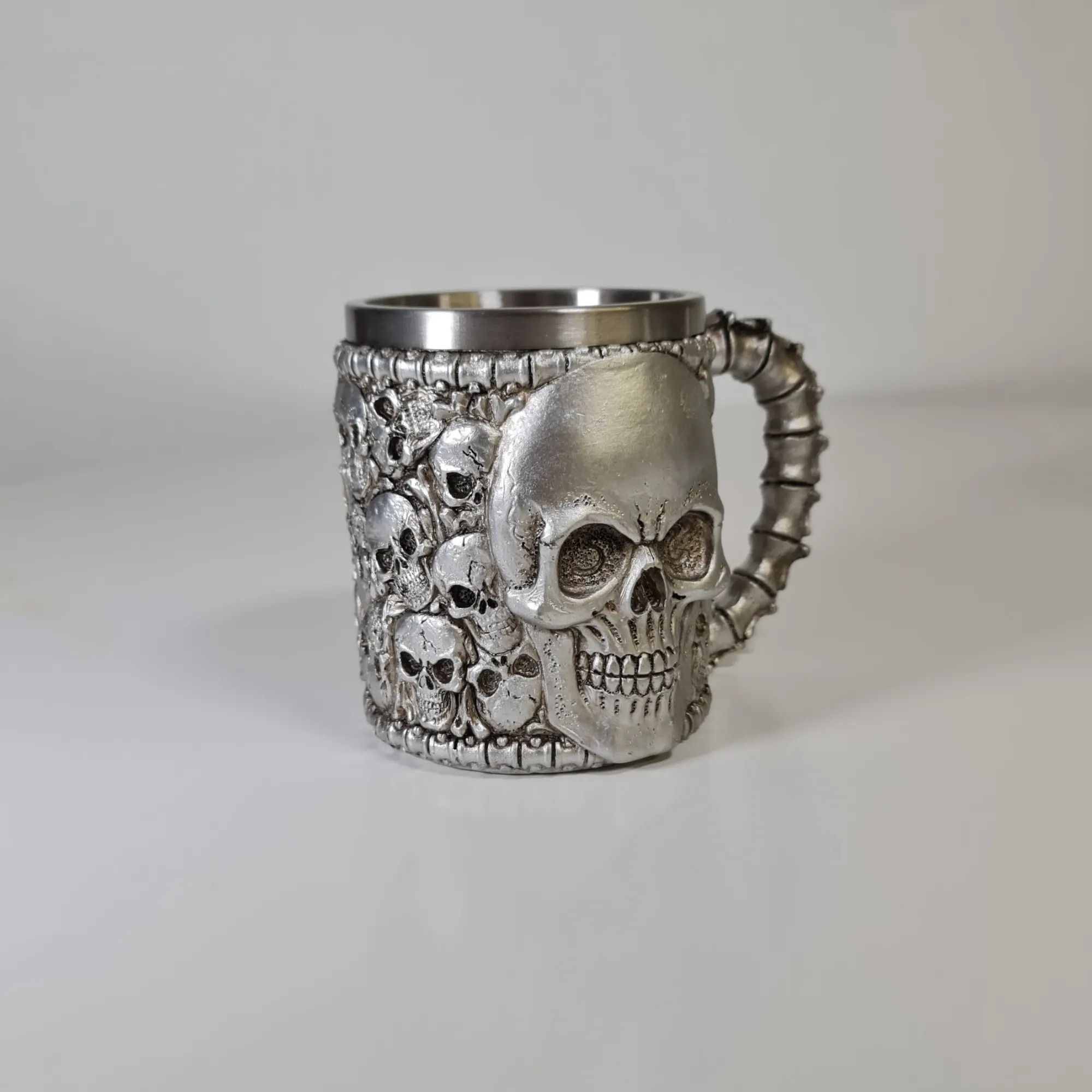 Su exterior de resina de alta calidad, esculpido con múltiples cráneos en detalle, y un mango con forma de huesos articulados, la convierten en un objeto único y llamativo. Con una capacidad perfecta para café, té, infusiones o bebidas frías, esta taza no solo sorprende visualmente, sino que también es práctica y resistente.